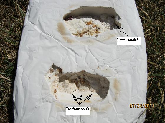 Two weeks later, she called me. Her husband had placed a bag of three apples about 10 feet up in a vine maple tree the day before. There was a suspicious branch break which they though might be squatch related. This is where they put the bag of apples. He had to use a stick to place the apples on the end of the branch break. The next morning, when she went out to check on the apples she found that the corner of the bag had been torn open and two apples were missing. On the ground, exactly where the mice had been placed, she found an apple that had been 80% eaten, and then put down. The bag was still in the tree and one apple could be seen. She recovered the apple core and put it in the freezer to keep it for me. I immediately drove down there to get the apple core. I also looked over the area with the witness and her husband. The ground is hard-packed, so no track impressions were visible. We found the other apple in the crotch of the maple tree. It had been pecked at by birds. Examining the apple core, what can be seen are teeth impressions. They are larger than human teeth, but smaller that a full grown sasquatch. There is a ridge down the center of each tooth, and there is a gap between each of the top front teeth. I was able to cut the apple in two, and cast each side. I had to hurry, as the apple was not lasting. We suspect that an adult sasquatch got an apple from the bag and gave it to a juvenile.